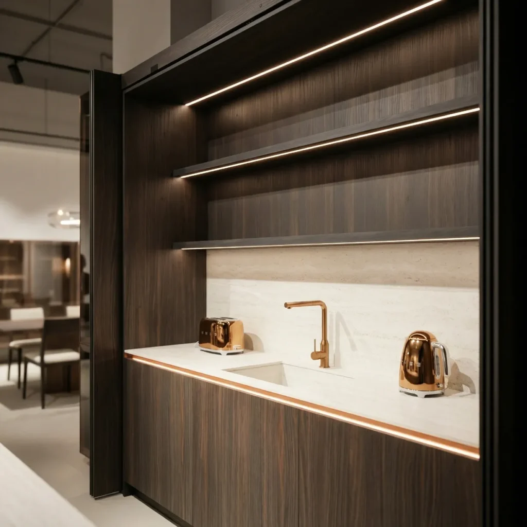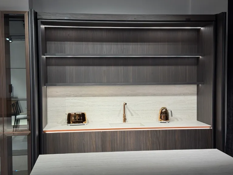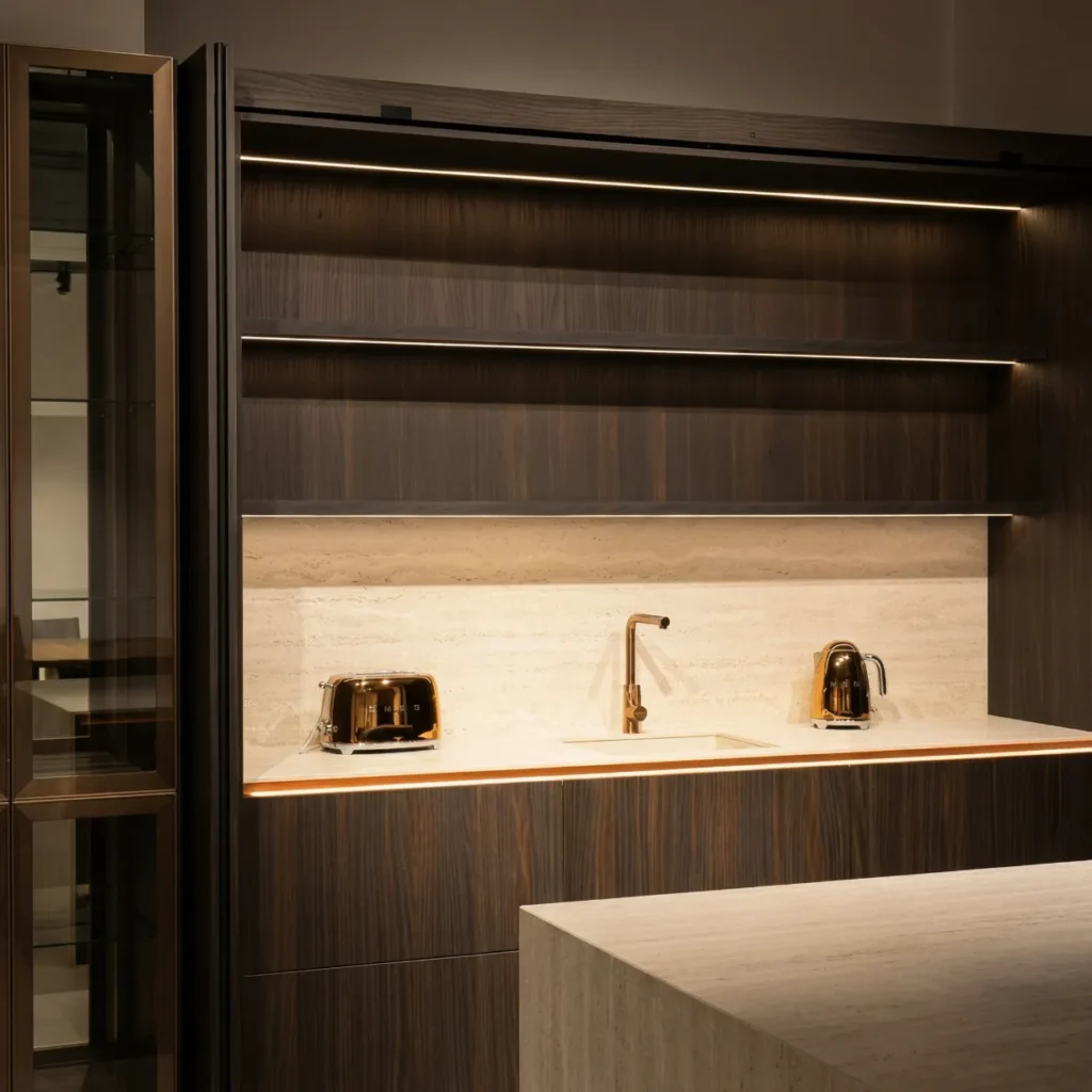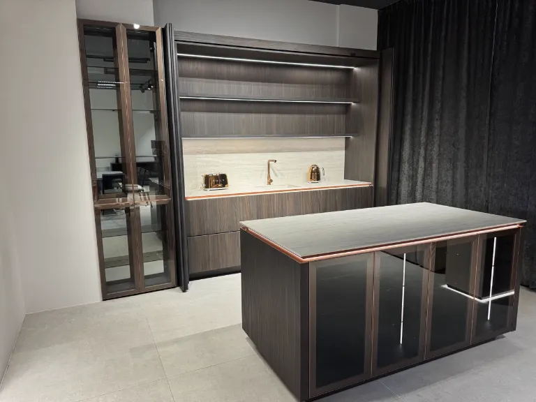 Bucătărie modernă, realizată la comandă, cu un design elegant în nuanțe de lemn închis și accente din sticlă.