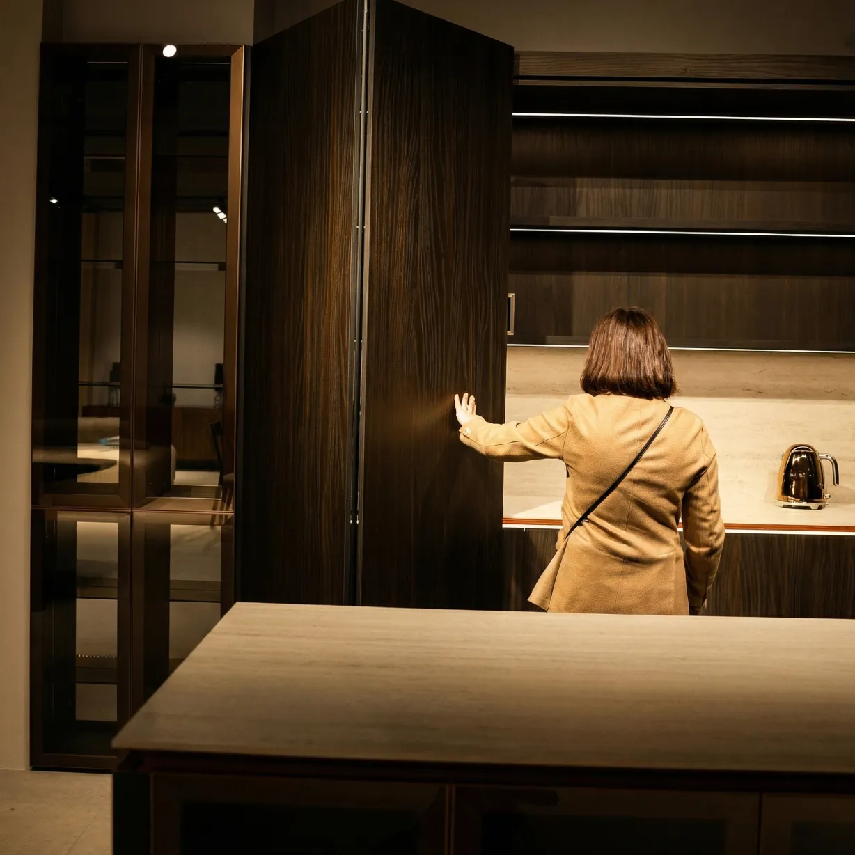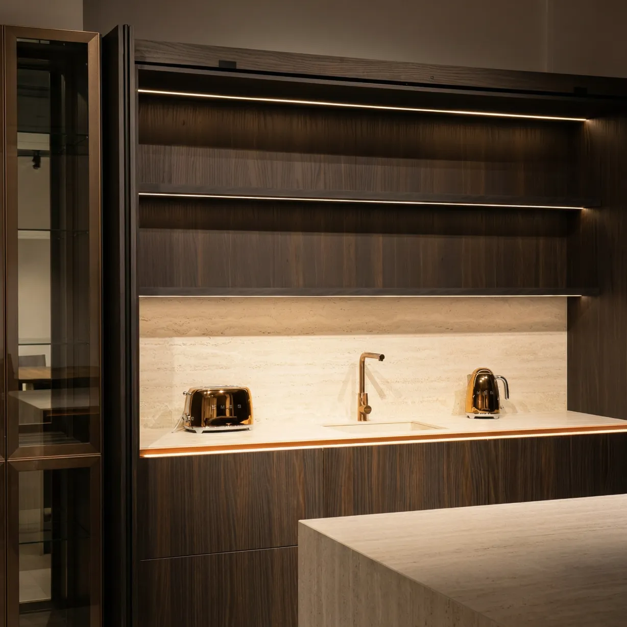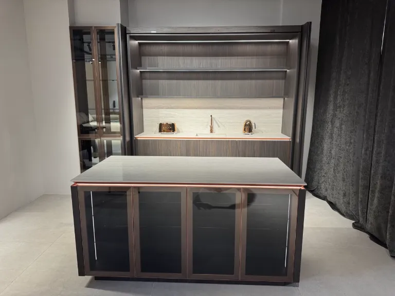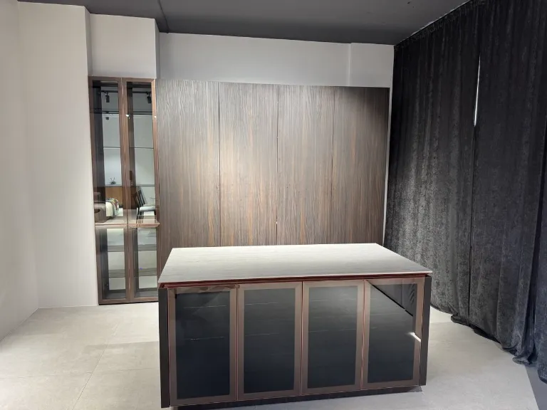 Include insulă practică pentru lucru și depozitare, vitrine cu sticlă și iluminare integrată, oferind un aspect premium și bine organizat.