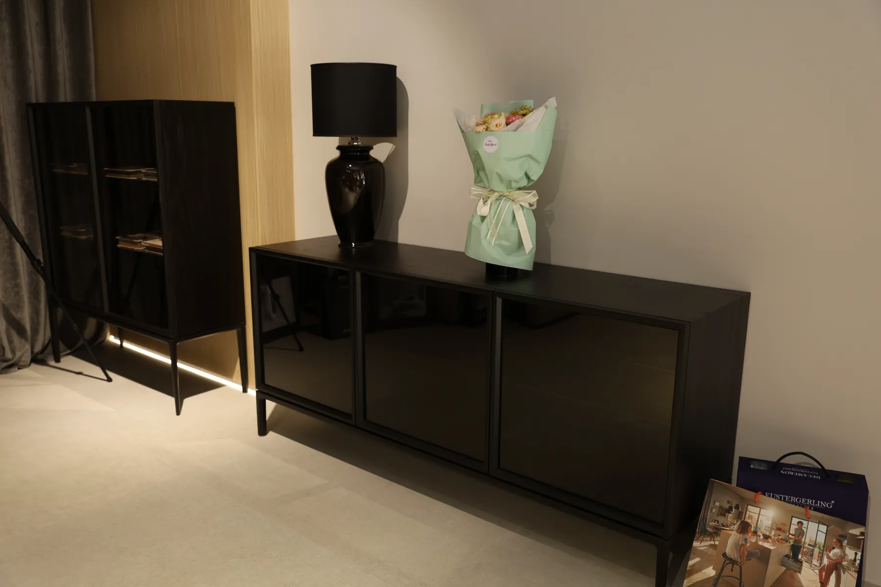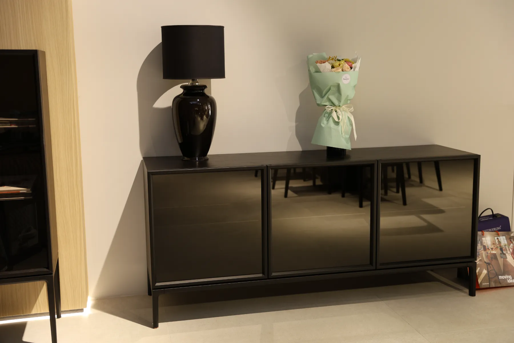 Comoda Haiko, în stil italian, este realizată din lemn natural și sticlă fumurie, oferind un aspect elegant și modern.