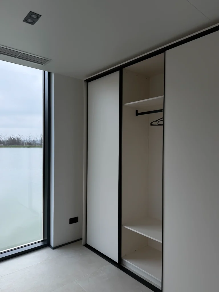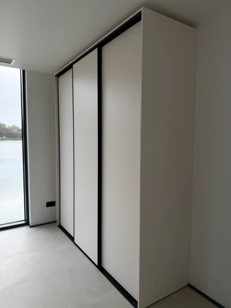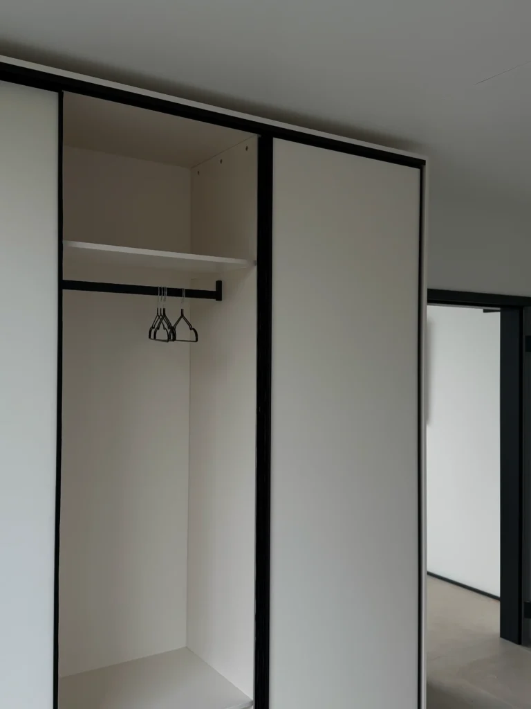 Dulap realizat la comandă, adaptat perfect spațiului. Design simplu, în culoare deschisă, cu uși glisante și profile negre pentru un contrast discret. Interiorul este bine organizat, cu rafturi și spațiu pentru haine, oferind depozitare practică și eficientă. Rezultatul este un dulap modern, funcțional și ușor de utilizat, integrat armonios în încăpere.