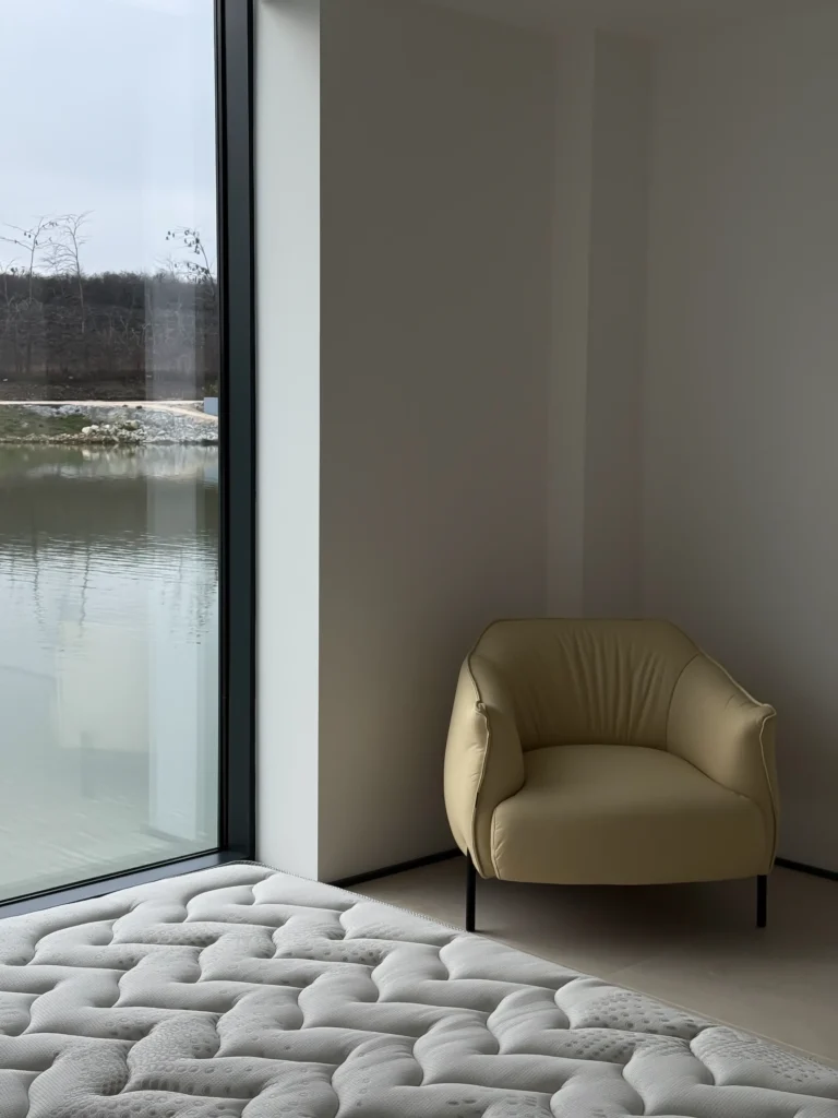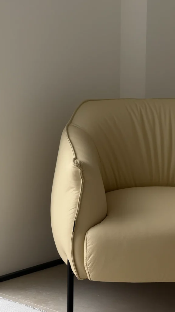 Mobilier din piele naturală realizat la comandă, într-o nuanță deschisă, cu design minimalist și elegant. Canapeaua, fotoliul și bancheta sunt realizate în același stil, oferind confort și un aspect unitar.